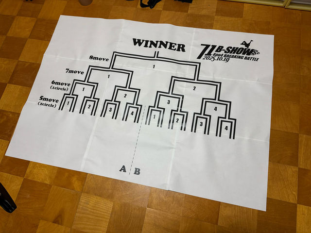 2025/10/3-トーナメント表など…This entry was posted in B-SHOW DANCE on 2025年10月4日 by cutsn B-SHOW前の恒例作業。 掲示用トーナメント表作り。 まずは決勝トーナメントから。 予選は2サークルで各6チーム、合計12チームをピックアップ。 敗者復活も2サークルで各2チーム、合計4チームをピックアップ。 以上16チームでのトーナメントを予定しております。 エントリー数が少ない場合は、減らすこともありますので、ご了承を(^^)