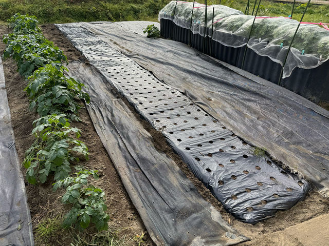 穴あきマルチを敷いて準備万端。
