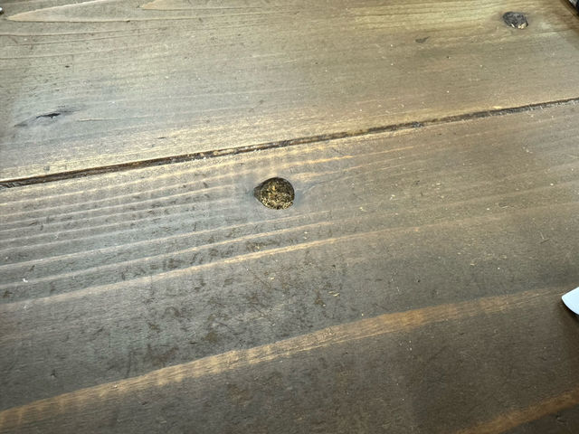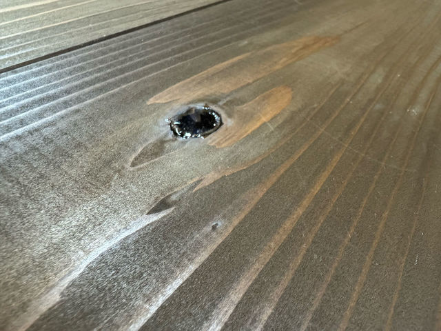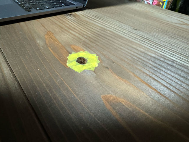 2025/11/28-レジンなど…This entry was posted in DIY on 2025年11月29日 by cutsn テーブルの天板は完成しましたが、節の穴が気になりますね。 で、レジンで埋めてみることにしました。 まずはマスキング。 レジンを入れて、紫外線を照射。 固まった〜 削ってツライチにしたいとこですが、ステイン塗ったばかりなので、とりあえずこのままで(^^;